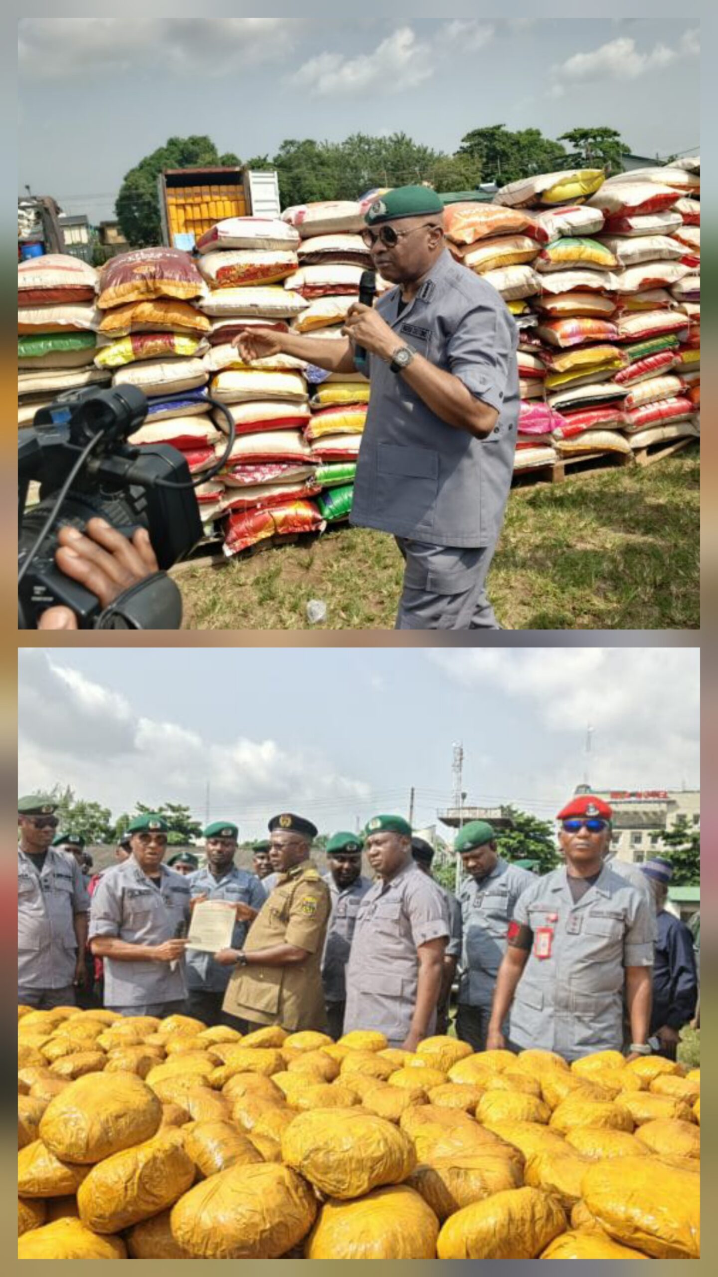 A breakdown of the seizures shows 6,954 bags of foreign parboiled rice (equivalent to 12 trailer loads), 77 bags of foreign sugar, and 21 units of used vehicles.
